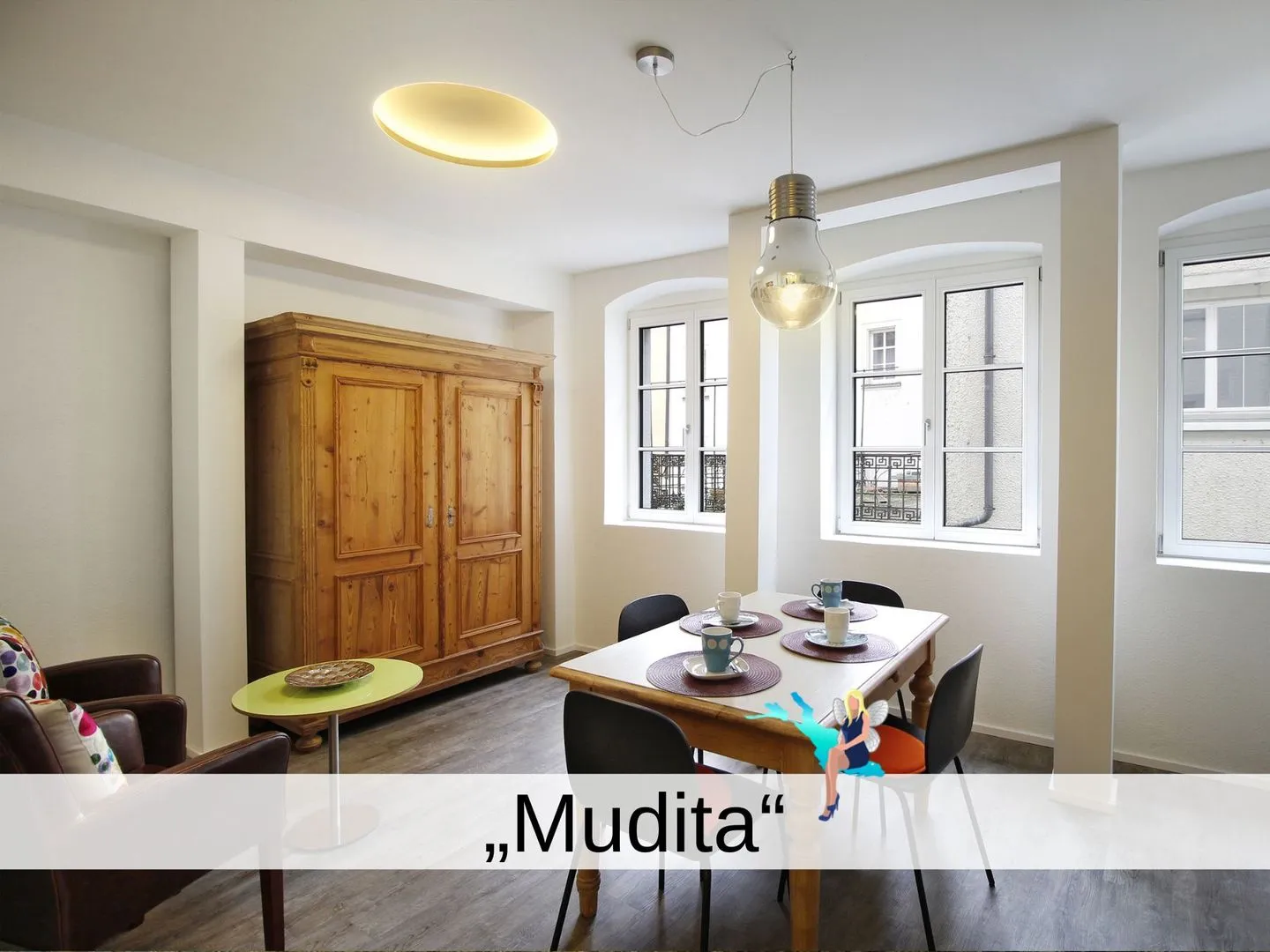 Diese renovierte, knapp 80 m² große Ferienwohnung im ersten Stock eines Hauses mit Aufzug ist in jeder Hinsicht etwas Besonderes. Die Ferienwohnung „Mudita“ ist die ehemalige Ferienwohnung Müller und trägt nun einen neuen, passenden Namen. Der Name „Mudita“, aus dem Sanskrit stammend, bedeutet Freude am Glück anderer – ein Gefühl, das sich in der warmen, harmonischen Atmosphäre dieser Wohnung widerspiegelt.