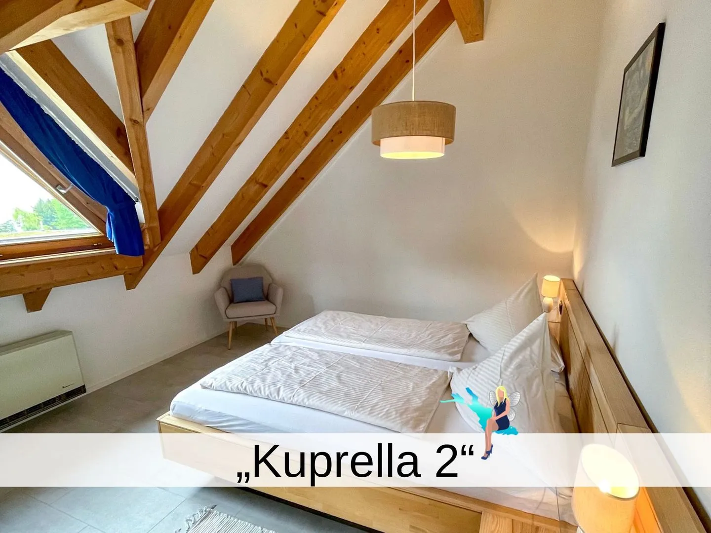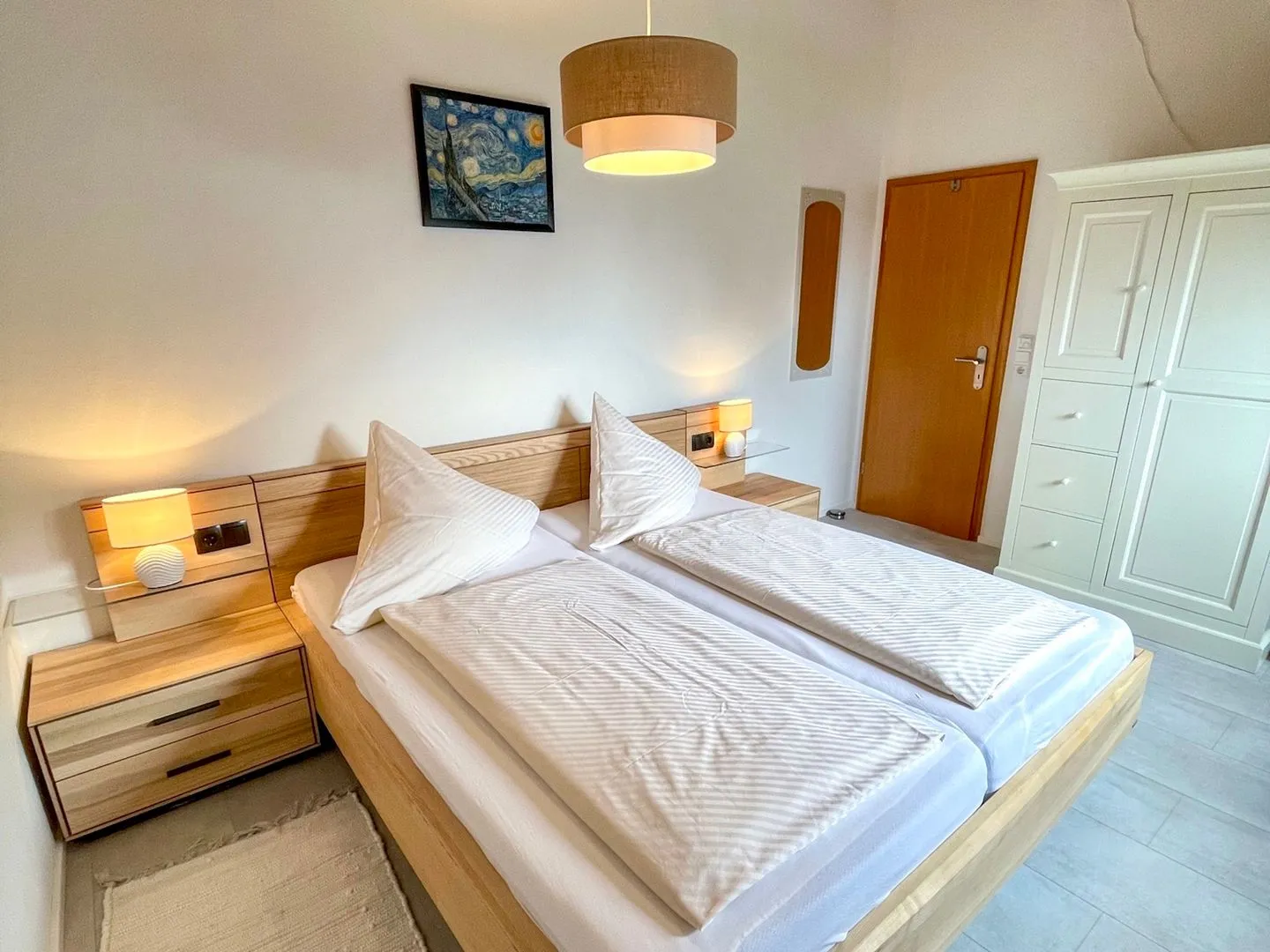 Die Ferienwohnung 2 befindet sich im 2. Obergeschoss des Ferienhauses 'Kuprella' in Nonnenhorn und bietet auf rund 75 m² idealen Komfort für bis zu vier Personen. Die großzügig geschnittene Wohnung verfügt über zwei separate Schlafzimmer – eines mit Doppelbett, das andere mit zwei Einzelbetten – sowie einen gemütlichen Wohnraum, der zum Entspannen einlädt. Die praktische Küchennische mit Mikrowelle und Spülmaschine ermöglicht eine komfortable Selbstversorgung, während das vollständig ausgestattete Badezimmer mit Dusche, WC und Fön zusätzlichen Komfort bietet.