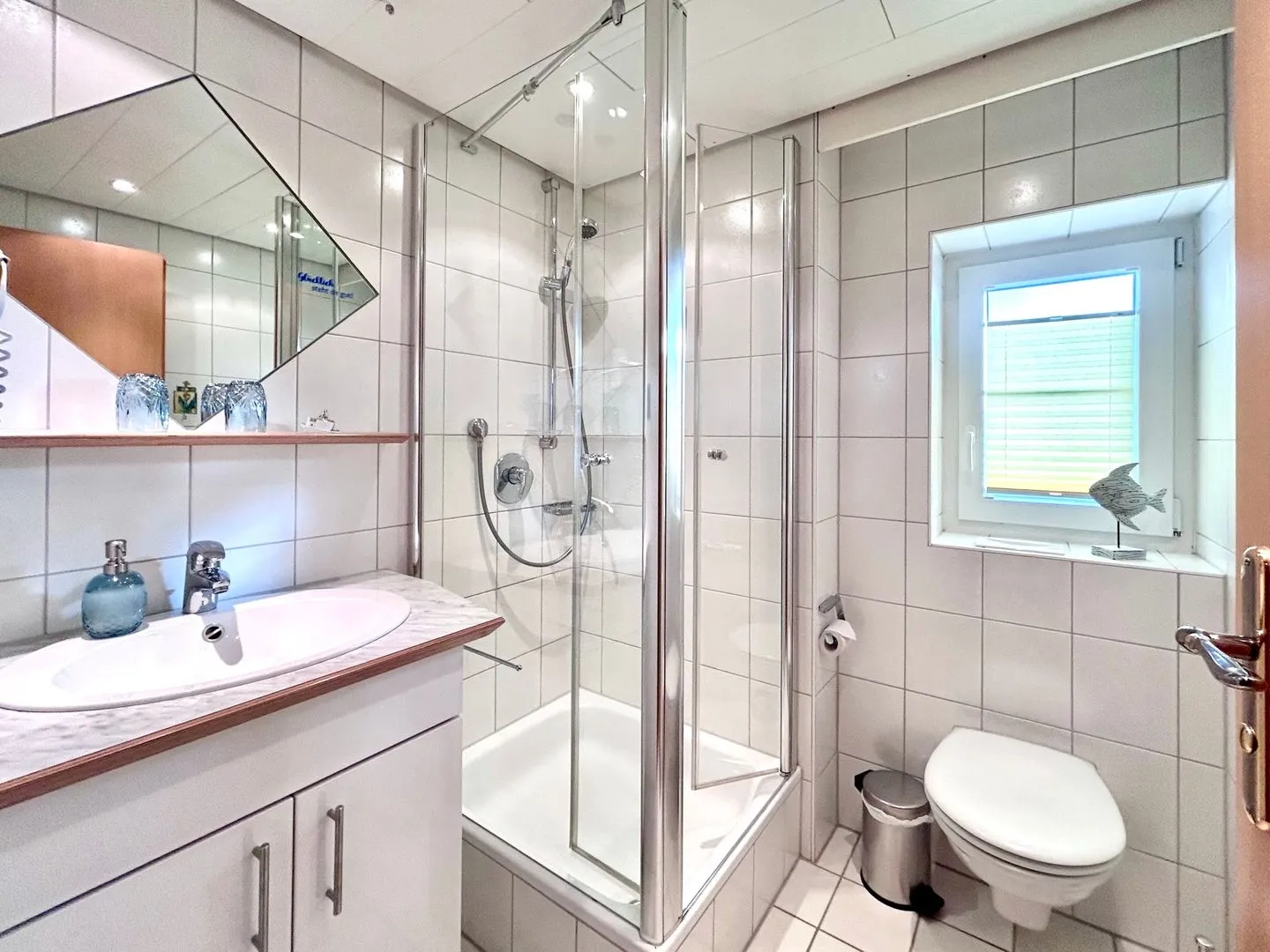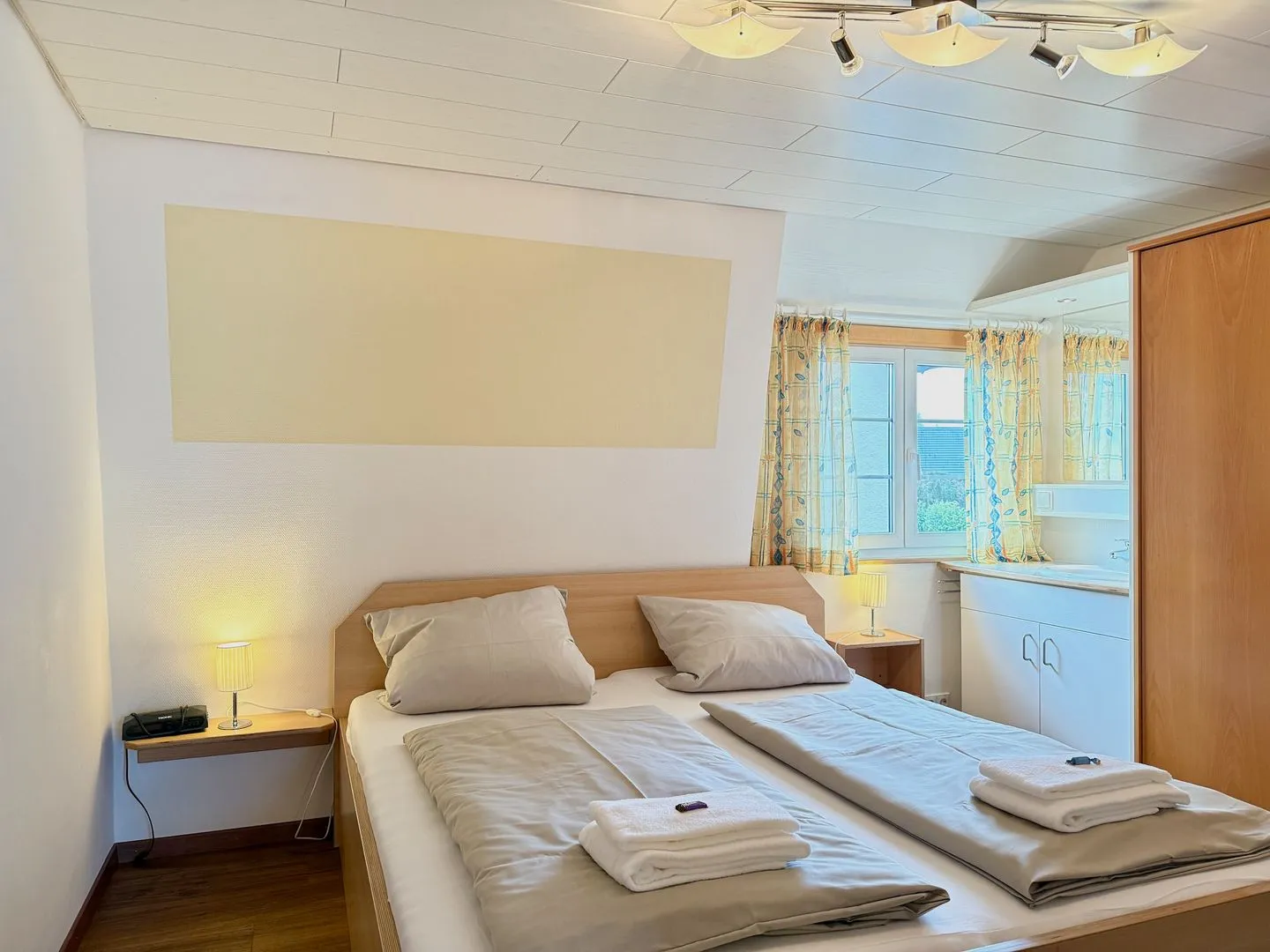 Die zwei getrennten Schlafzimmer sorgen für Privatsphäre und erholsamen Schlaf. Beide sind mit bequemen Doppelbetten und großzügigen Kleiderschränken ausgestattet. Ein zusätzliches Highlight: In jedem der Schlafzimmer befindet sich ein praktischer Waschtisch.