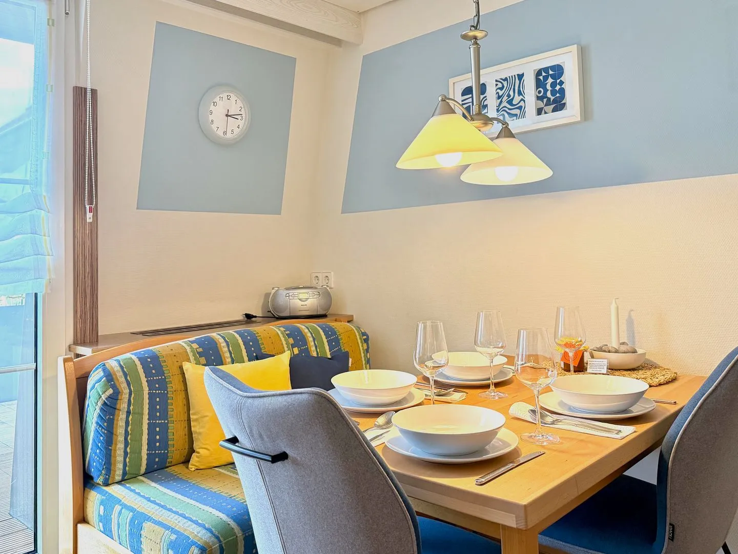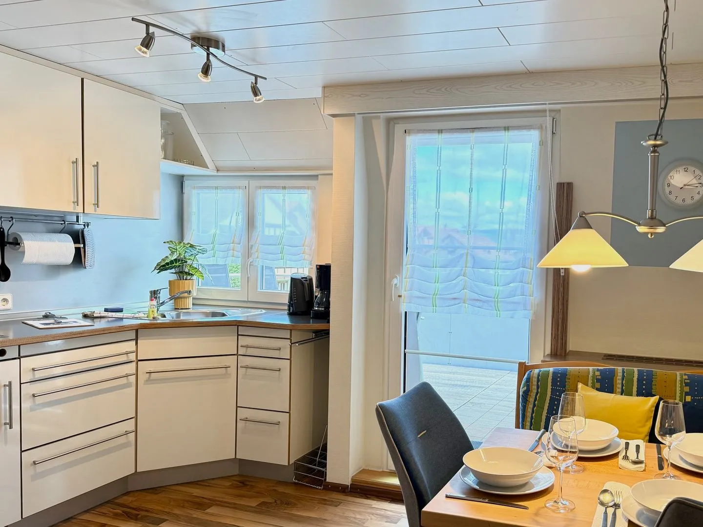 Der Wohn- und Essbereich ist der zentrale Treffpunkt der Wohnung. Hier finden Sie eine voll ausgestattete Einbauküche mit allem, was das Herz begehrt: ein 4-Platten-Ceranfeld, Kühlschrank, Kochutensilien, Kaffeemaschine, Wasserkocher, Toaster, Eierkocher, Salatschleuder und ein Handrührgerät – ideal für gemeinsame Kochabende. Die gemütliche Sitzecke mit Blick auf den großen Balkon lädt zum Entspannen, TV-Schauen oder zu gemeinsamen Mahlzeiten ein.